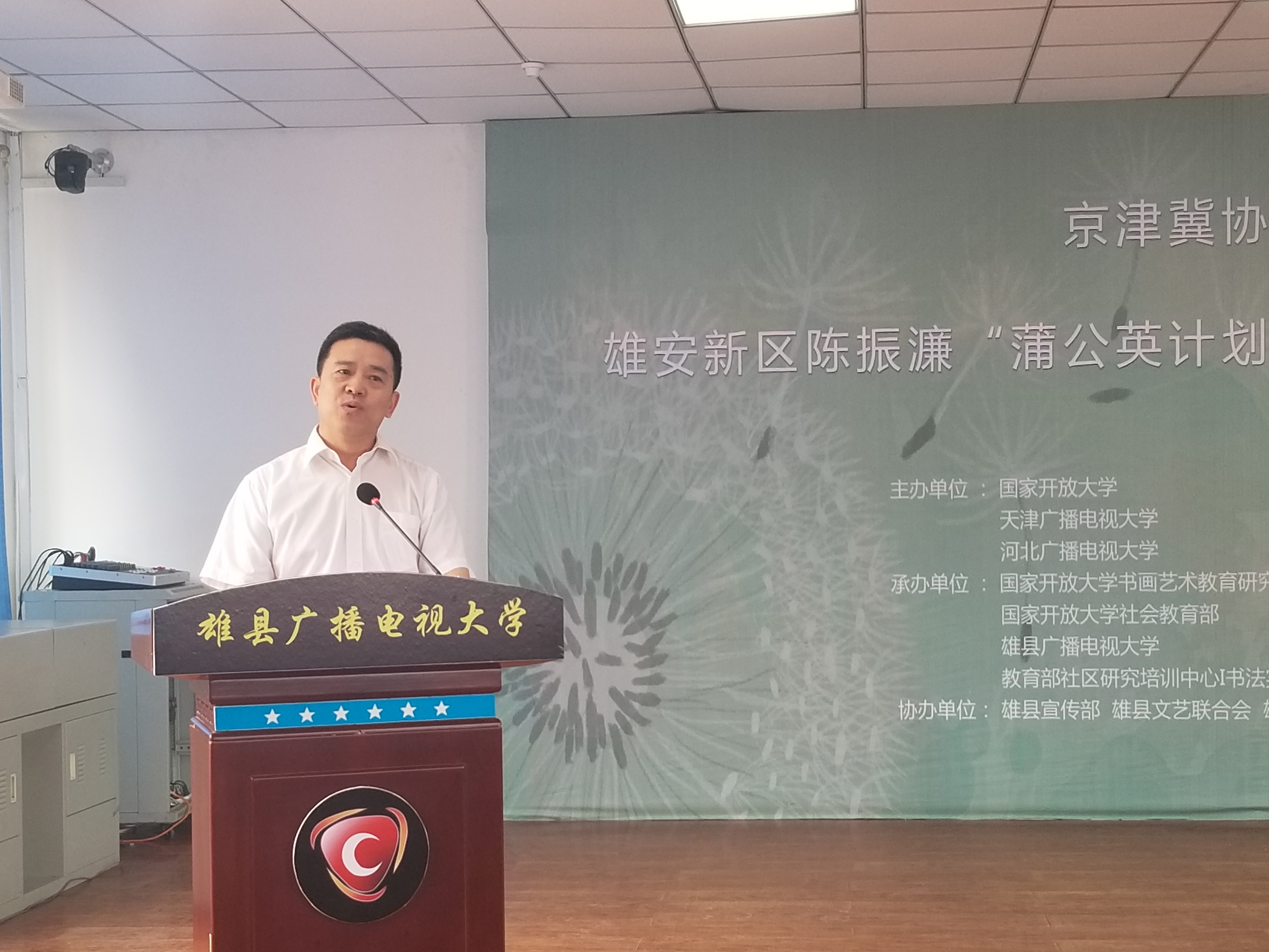7月10日上午,為期一周的中小學書法教師“蒲公英計劃”培訓項目在雄縣電大隆重開幕。本次培訓是國家開放大學聯合天津廣播電視大學、河北廣播電視大學以及雄安新區公共服務管理局、雄縣人民政府共同開展的。中國文聯副主席、全國書法教師“蒲公英計劃”大型公益培訓發起者陳振濂、河北廣播電視大學校長段潤保、天津廣播電視大學副校長劉智剛,以及雄安新區相關領導,保定電大、雄縣電大主要領導出席了開幕式,來自雄安新區三縣的100余名書法教師參加了啟動儀式。