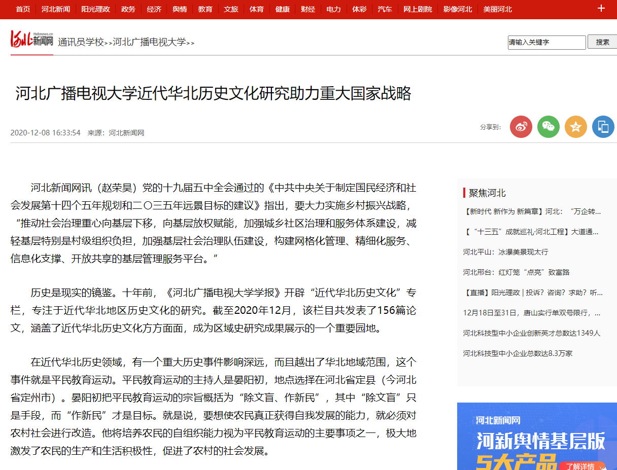 2020年12月8日,河北新聞網(wǎng)發(fā)文《河北廣播電視大學(xué)近代華北歷史文化研究助力重大國(guó)家戰(zhàn)略》。文章指出:《河北廣播電視大學(xué)學(xué)報(bào)》發(fā)表了多篇有關(guān)平民教育運(yùn)動(dòng)和定縣研究的論文,從全新的視角詮釋了平民教育運(yùn)動(dòng)的歷史價(jià)值和現(xiàn)實(shí)意義,不僅深化了對(duì)平民教育運(yùn)動(dòng)的研究,更揭示了平民教育運(yùn)動(dòng)對(duì)于當(dāng)下鄉(xiāng)村振興的路徑與經(jīng)驗(yàn)價(jià)值。此外,還發(fā)表了多篇有關(guān)平民教育運(yùn)動(dòng)和農(nóng)村社會(huì)改造的論文,關(guān)注農(nóng)村基層社會(huì)治理,試圖從歷史上的成功做法中吸收經(jīng)驗(yàn),服務(wù)于當(dāng)前的鄉(xiāng)村振興戰(zhàn)略和城鄉(xiāng)一體化發(fā)展目標(biāo)。