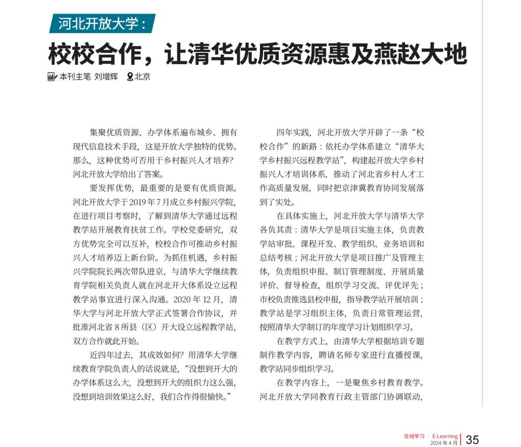【編者按】近日,由教育部主管,國家開放大學主辦,《中國遠程教育》雜志社出版的《在線學習》期刊,在2024年4月(月刊)/總102期中的“發力!鄉村振興,高校擔當”封面專題中,以《校校合作,讓清華優質資源惠及燕趙大地》為題,刊載我校鄉村振興的典型事跡。
