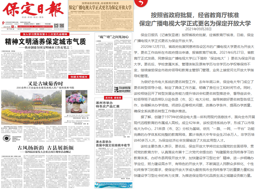 2020年12月7日,省政府批復(fù)同意將各設(shè)區(qū)市的廣播電視大學(xué)更名為開放大學(xué),更名工作由所在市政府提出申請,報省教育廳核準。2021年6月27日,省教育廳正式發(fā)函,同意保定廣播電視大學(xué)(以下簡稱“保定電大”)更名為保定開放大學(xué)。更名后,學(xué)校隸屬關(guān)系、管理體制及原有學(xué)歷與非學(xué)歷辦學(xué)權(quán)等保持不變,繼續(xù)接受保定市政府領(lǐng)導(dǎo)和教育主管部門管理,業(yè)務(wù)上接受河北開放大學(xué)指導(dǎo)和管理。