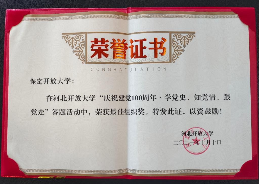 近日,由河北開放大學組織的“慶祝建黨100周年?學黨史、知黨情、跟黨走”黨史知識答題活動獲獎名單揭曉。保定開放大學喜獲佳績,系統內7名教師、22名學員,共29人獲個人獎,保定開放大學榮獲最佳組織獎(全省共4所市級開放大學獲獎)。