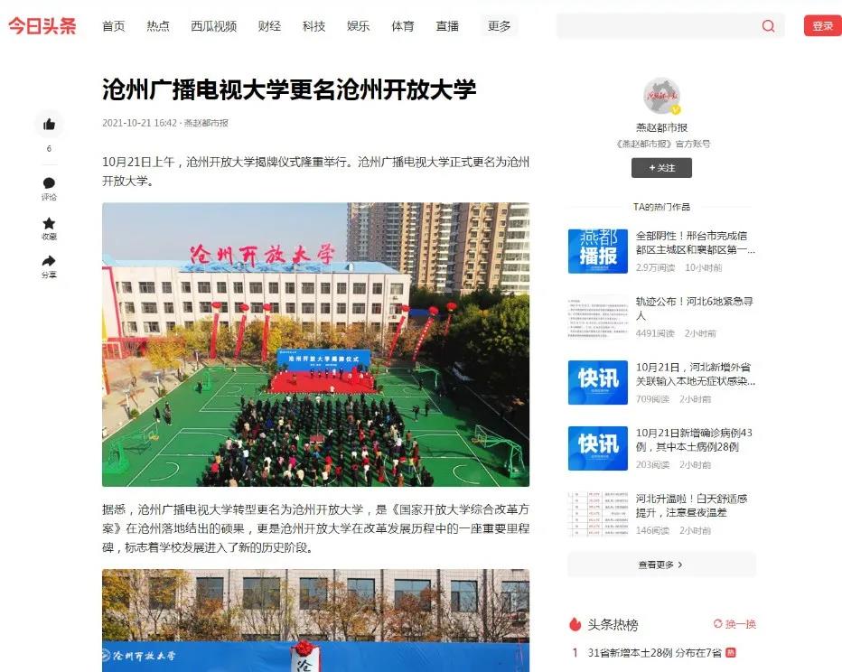 日前,滄州開放大學(xué)舉行揭牌儀式,網(wǎng)易新聞、河北新聞網(wǎng)、《燕趙都市報》新媒體、長城網(wǎng)、《滄州日報》、《滄州晚報》、滄州電視臺、滄州電臺等媒體對揭牌更名和滄州廣播電視大學(xué)所做的歷史貢獻(xiàn)給予了報道。此后,《人民日報》、《瀟湘晨報》等報刊新媒體和騰訊網(wǎng)、新浪網(wǎng)、今日頭條、一點(diǎn)資訊、新浪微博等十余家媒體平臺對報道進(jìn)行轉(zhuǎn)載,進(jìn)一步提升了滄州開放大學(xué)的知名度和美譽(yù)度。