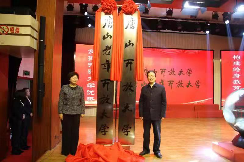 揭牌儀式最后,由唐山市政府副市長張月仙、河北開放大學校長段潤保共同為唐山開放大學和唐山老年開放大學揭牌。