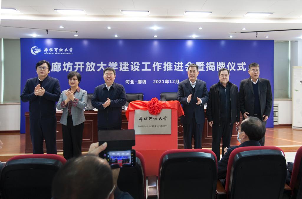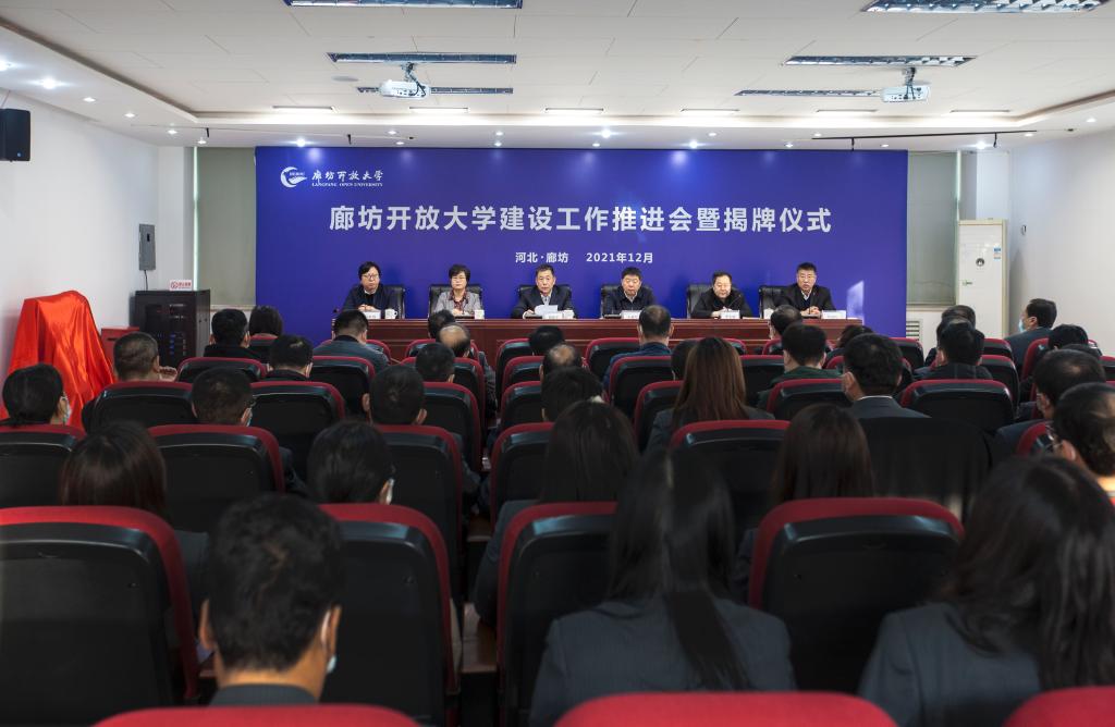 12月15日上午,廊坊開放大學建設工作推進會暨揭牌儀式隆重舉行。河北開放大學黨委書記籍獻平、廊坊市委副書記王亞軍、廊坊市政府副市長張春燕、廊坊市教育工委書記李宏疆,廊坊市教育局局長許紅偉出席會議,各縣(市、區)教育局負責同志,廊坊開放大學領導班子成員、全體中層干部、各縣級電大負責人60余人參加會議,李宏疆主持會議。