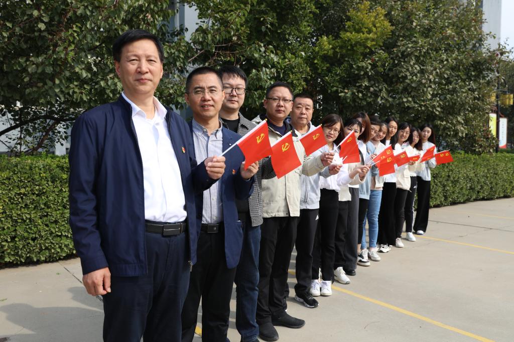 活動中,各黨支部組織黨員手持黨旗,在“我與黨旗合個影”主題展板前拍照留念。