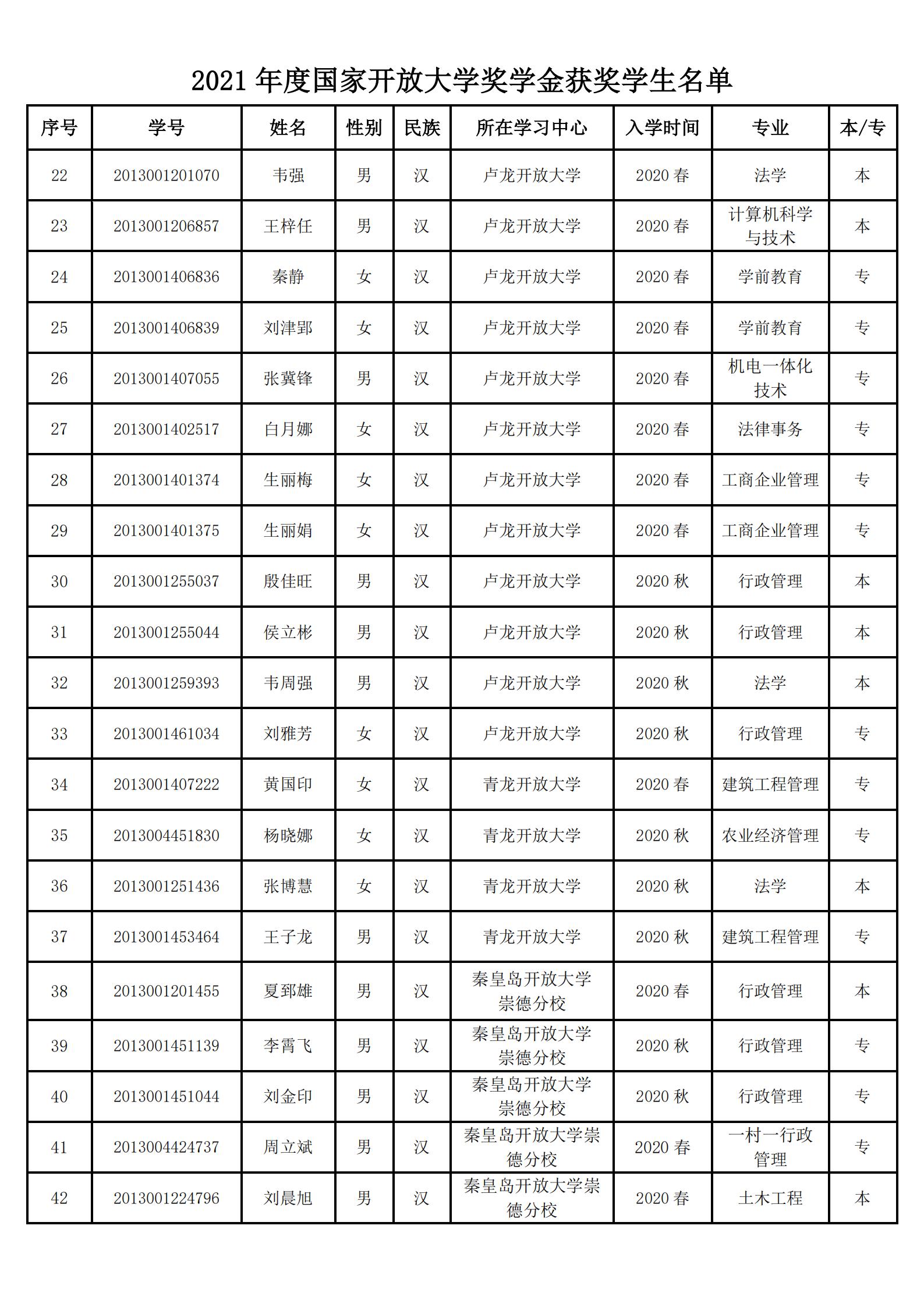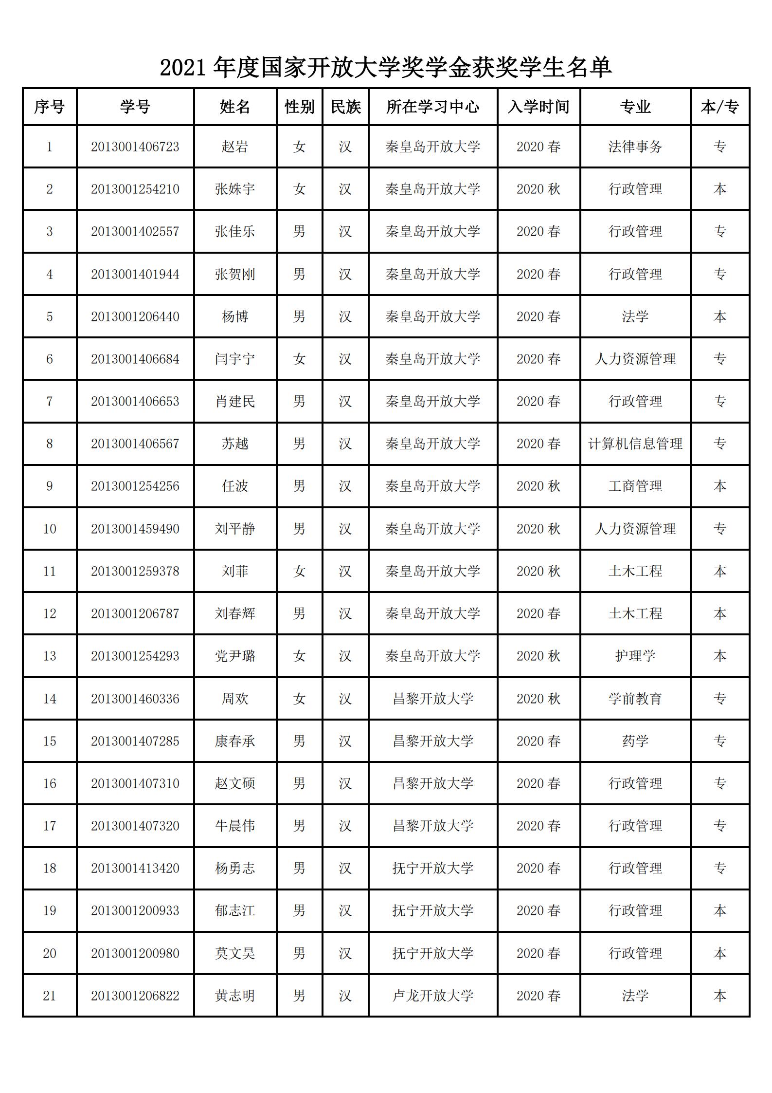 根據(jù)國(guó)家開放大學(xué)《關(guān)于開展2021年度國(guó)家開放大學(xué)獎(jiǎng)學(xué)金評(píng)選工作的通知》(國(guó)開學(xué)生函〔2021〕14號(hào))和《河北開放大學(xué)關(guān)于開展2021年度開放教育獎(jiǎng)學(xué)金評(píng)選工作的通知》(冀開大教字〔2022〕號(hào))文件精神,近日,國(guó)家開放大學(xué)公布2021年度學(xué)生獎(jiǎng)學(xué)金評(píng)審結(jié)果,秦皇島開放大學(xué)市縣兩級(jí)共有趙巖等44名學(xué)生獲得獎(jiǎng)學(xué)金,每人獎(jiǎng)金1500元,獲獎(jiǎng)學(xué)生數(shù)突破以往。