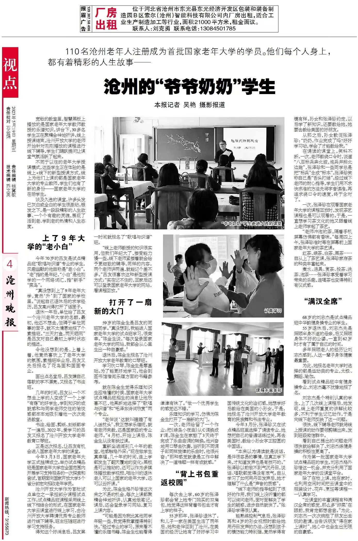 日前,《滄州晚報》以《滄州的“爺爺奶奶”學生》為題報道了我校老年教育試點精品班項目的實施情況,文章介紹了呂友、陳金生、張澤珍、劉志杰四位首批注冊學員在滄州開放大學的求學事跡。求學期間他們刻苦學習,不僅彌補了自己學生時代的遺憾,收獲了個人的成長,也用自己的言傳身教為孩子樹立了終身學習的榜樣。