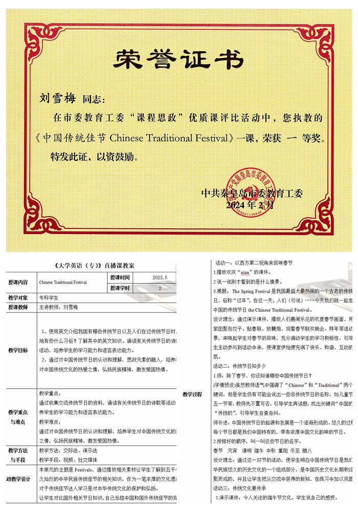 近日,中共秦皇島市委教育工委發布了《關于開展“優秀黨課”評比結果的通報》、《課程思政優質課評比活動獲獎情況的通報》,秦皇島開放大學黨委書記、校長趙清元的《重溫黨的自我革命發展歷程堅持把全面從嚴治黨引向深入》黨課獲一等獎。在“課程思政”優質課評比活動中,劉雪梅老師的《中國傳統佳節Chinese Traditional Festival》榮獲一等獎、李穎老師的《網絡購物中的侵權問題和安全問題》獲得二等獎。