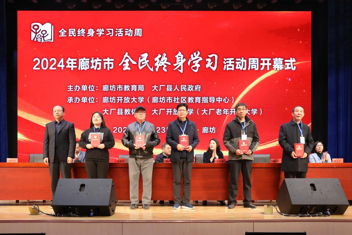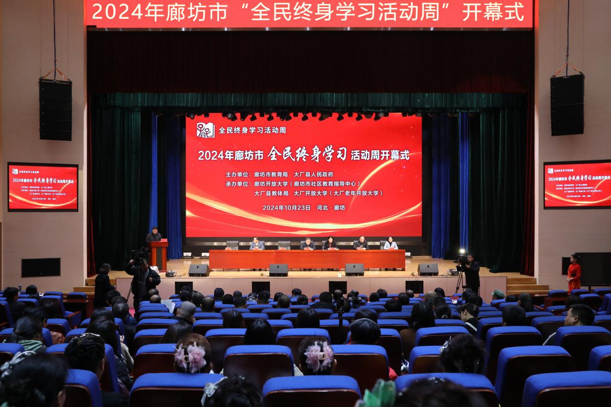 10月23日,2024年廊坊市全民終身學習活動周開幕式在大廠開放大學舉行。本次開幕式由廊坊市教育局、大廠縣人民政府主辦,廊坊開放大學、大廠縣教體局、大廠開放大學承辦。河北開放大學宣傳統戰部部長、社區教育學院院長王麗娟,市委教育工委書記、市教育局黨組書記李宏疆,廊坊開放大學黨委書記馬利國,大廠縣人民政府副縣長李建軍出席開幕式。市委宣傳部、市委社會工作部等市直單位有關負責人,各縣(市)區教育局、市屬高校有關負責同志、“百姓學習之星”、“終身學習品牌項目”獲獎單位及代表、社區教育、老年教育學員、大廠職業技術教育中心學生近400人參加開幕式。
