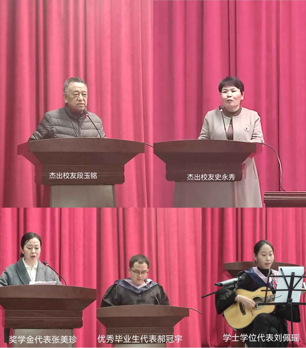 杰出校友邯鄲學(xué)院黨委原副書記段玉銘、邯鄲知名企業(yè)家史永秀,優(yōu)秀畢業(yè)生代表郝冠宇,獎(jiǎng)學(xué)金獲得者代表張美珍分別結(jié)合自己的學(xué)習(xí)和工作進(jìn)行了發(fā)言。學(xué)士學(xué)位獲得者劉佩瑤給大家?guī)砹艘皇拙实募麖棾?/p>