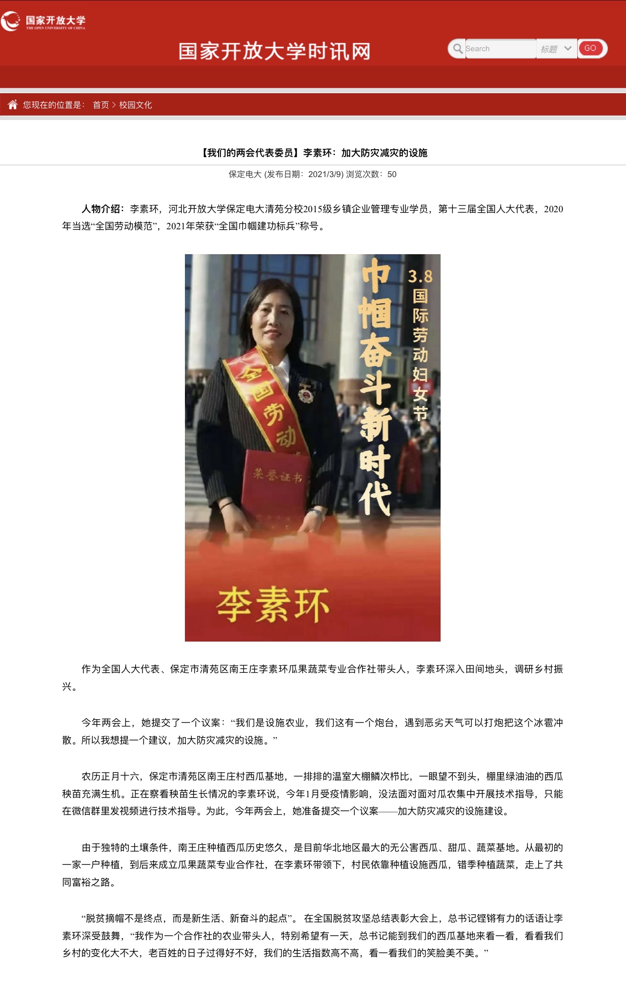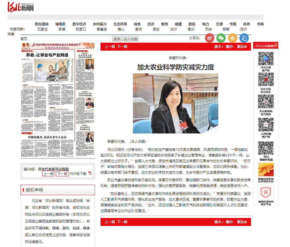 “我們的生產基地有15萬畝瓜果蔬菜,風調雨順的時候,一畝地能收益2萬元。我還在河北開放大學保定清苑分校報讀了鄉鎮企業管理專業,準備跟鄉親們大干一場,讓大家都過上好日子。”全國人大代表、保定市清苑區南王莊李素環瓜果合作社社長李素環說,“好日子”卻有時面臨大難處,連續三年西瓜準備上市時節都遭遇較大冰雹襲擊,瓜農們損失慘重。為此,她建議有關部門給予重視,加大農業科學防災減災力度,為鄉村振興產業發展保駕護航。