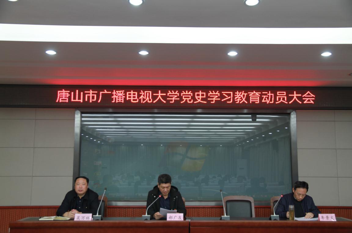 3月18日上午,唐山電大在遠教樓學術報告廳組織召開黨史學習教育動員大會。黨委書記、校長郝廣友,黨委委員、副校長牟景文,黨委委員、紀委書記吳萬林出席會議,學校全體黨員參加會議。會議由黨委委員、副校長牟景文主持。