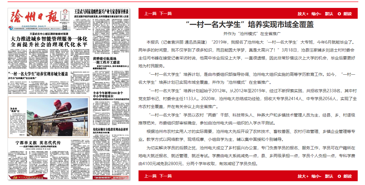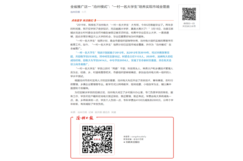 3月22日,《滄州日報》頭版以《“一村一名大學生”培養實現市域全覆蓋并作為“滄州模式”在全省推廣》為題,對滄州電大獲得市委表彰的“農村黨員干部大專學歷教育”這一亮點工作進行報道,滄州市政府官方微信公眾號滄州政務、滄州日報官方公眾號同步推送。