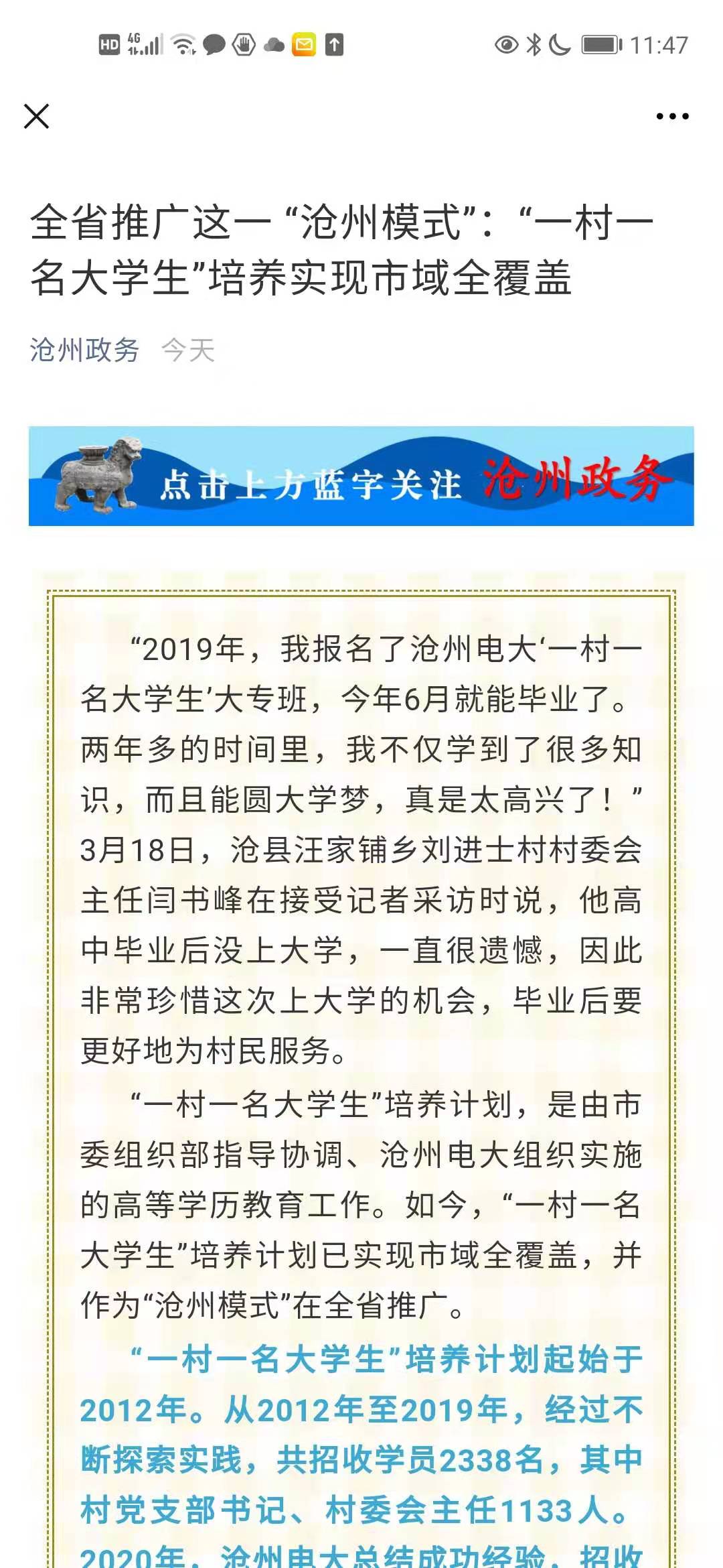全省推廣這一 “滄州模式”:“一村一名大學生”培養實現市域全覆蓋