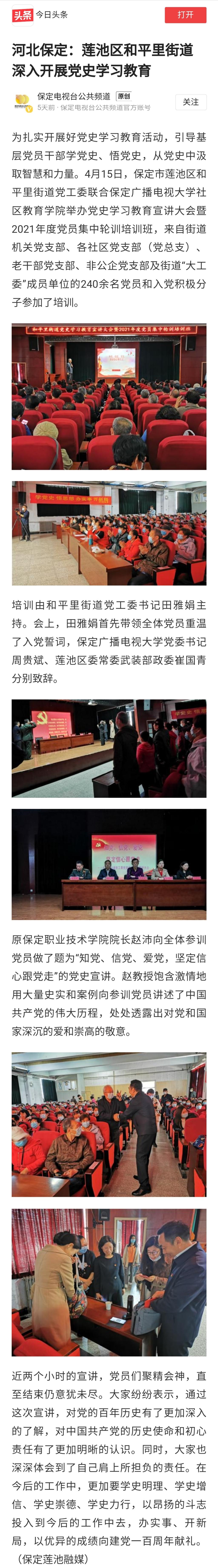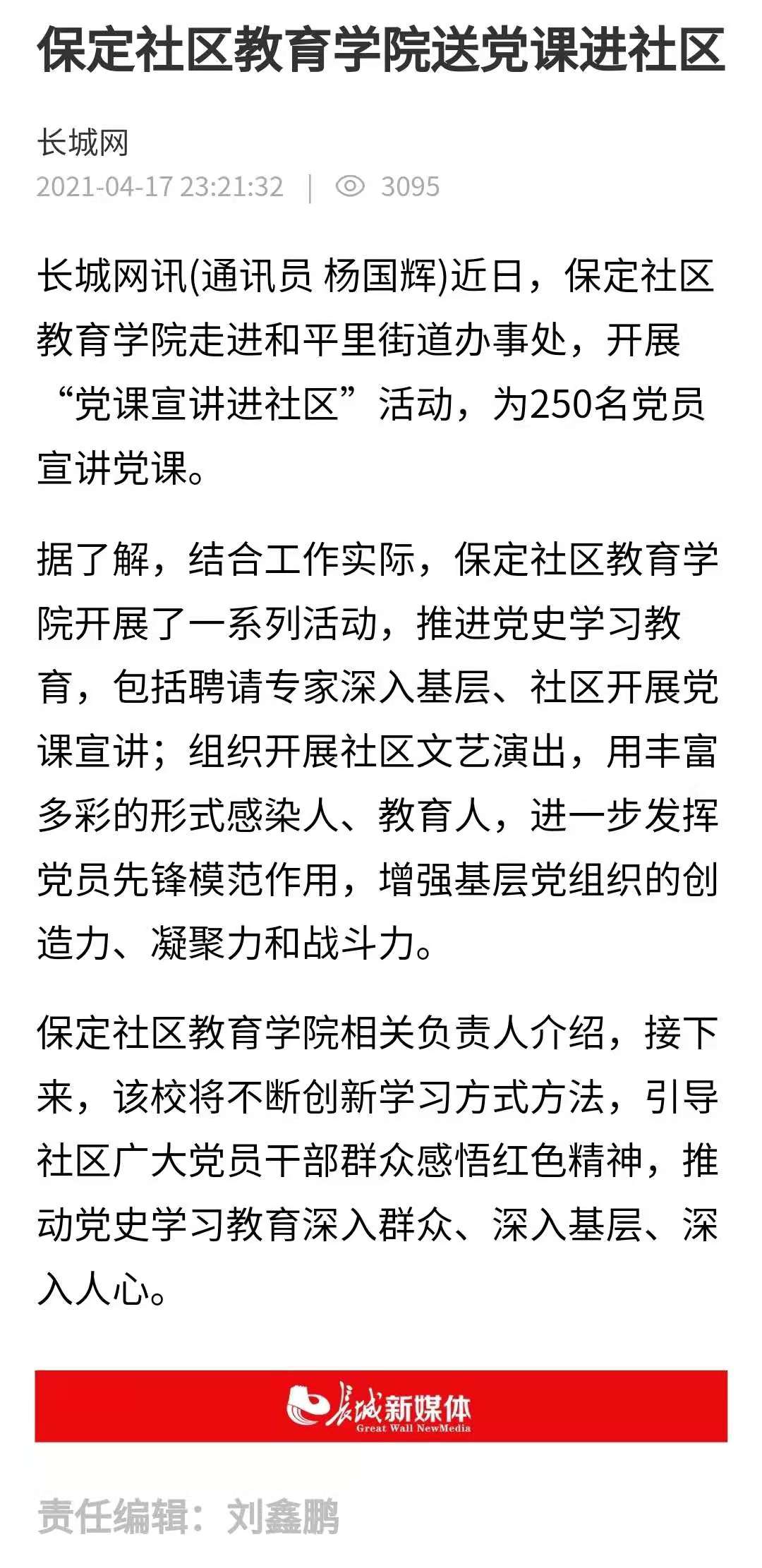 保定社區(qū)教育學(xué)院相關(guān)負(fù)責(zé)人介紹,接下來,該校將不斷創(chuàng)新學(xué)習(xí)方式方法,引導(dǎo)社區(qū)廣大黨員干部群眾感悟紅色精神,推動黨史學(xué)習(xí)教育深入群眾、深入基層、深入人心。