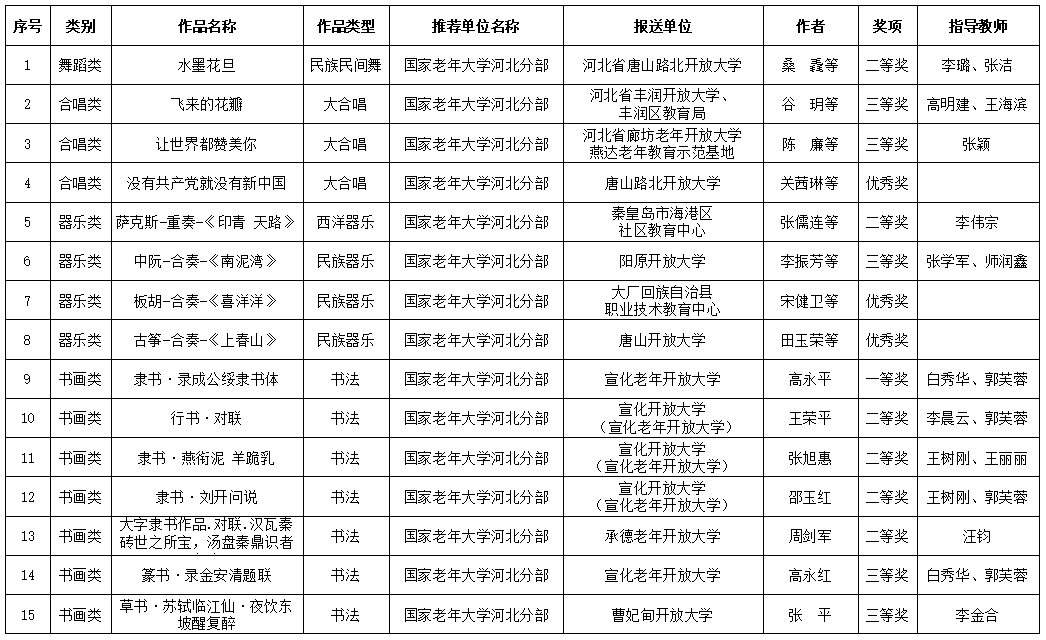近日,國家老年大學(xué)陸續(xù)公示了2024年全國老年教育各類教學(xué)成果展的評選結(jié)果,國家老年大學(xué)河北分部報送的作品中,有31項(xiàng)獲獎,包括書畫類15幅,攝影類8幅,器樂類4項(xiàng),合唱類3項(xiàng),舞蹈類1項(xiàng),另評選出優(yōu)秀指導(dǎo)教師26人。其中,宣化老年開放大學(xué)書畫類作品《隸書·錄成公綏隸書體》《笑口常開》、攝影類作品《駱駝沖沙》喜獲一等獎。